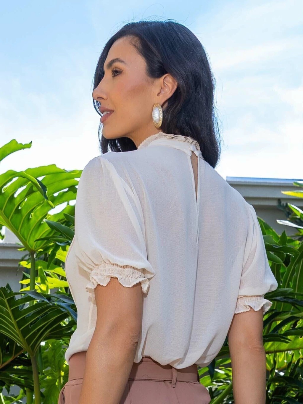 Sua modelagem reta valoriza diferentes silhuetas, enquanto a gola alta com babadinho adiciona charme ao visual. As mangas curtas levemente bufantes com punhos em elastéx e babadinho proporcionam conforto e feminilidade.