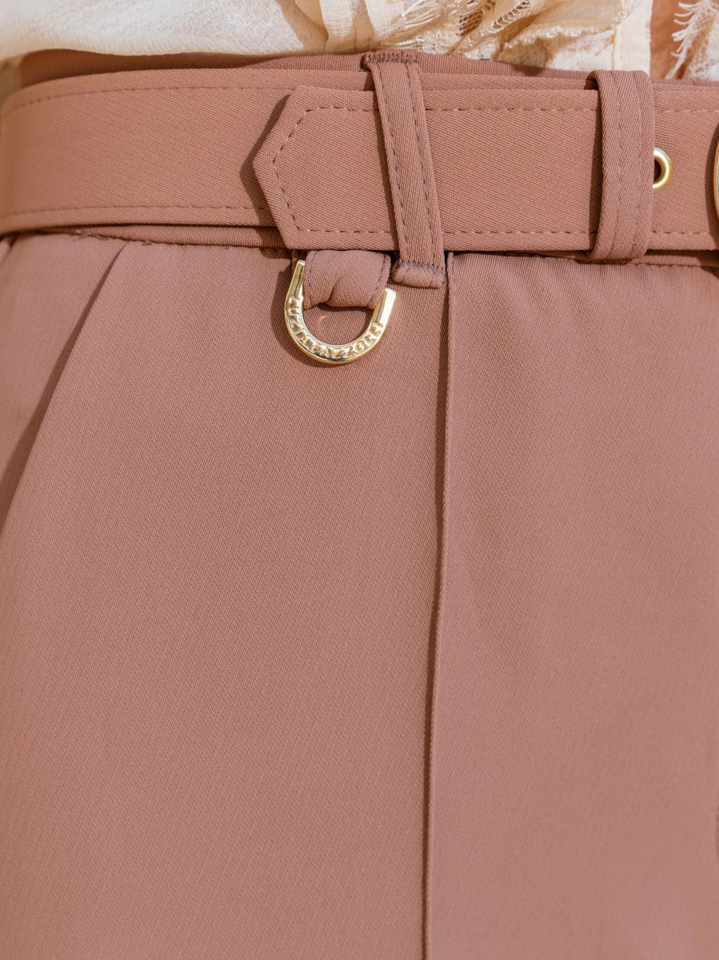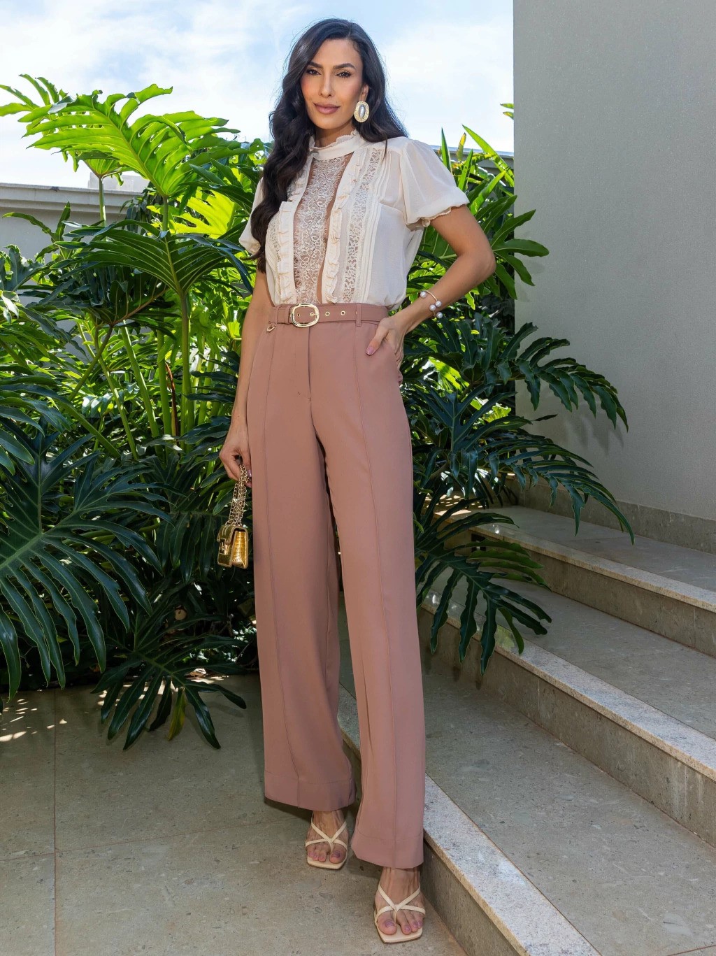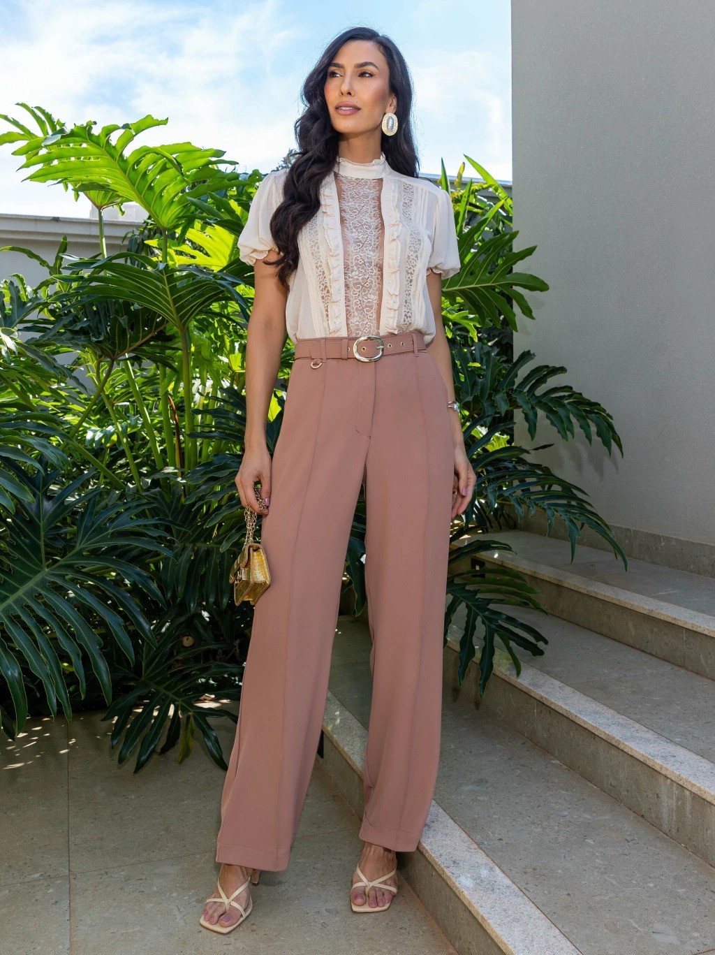 Sua modelagem reta e cintura média alongam a silhueta, enquanto o comprimento longo traz modernidade. O cós com passantes e o cinto faixa com fivela de metal permitem ajuste perfeito e toque refinado. Destaque para as nervuras verticais no centro da perna, que valorizam o visual.