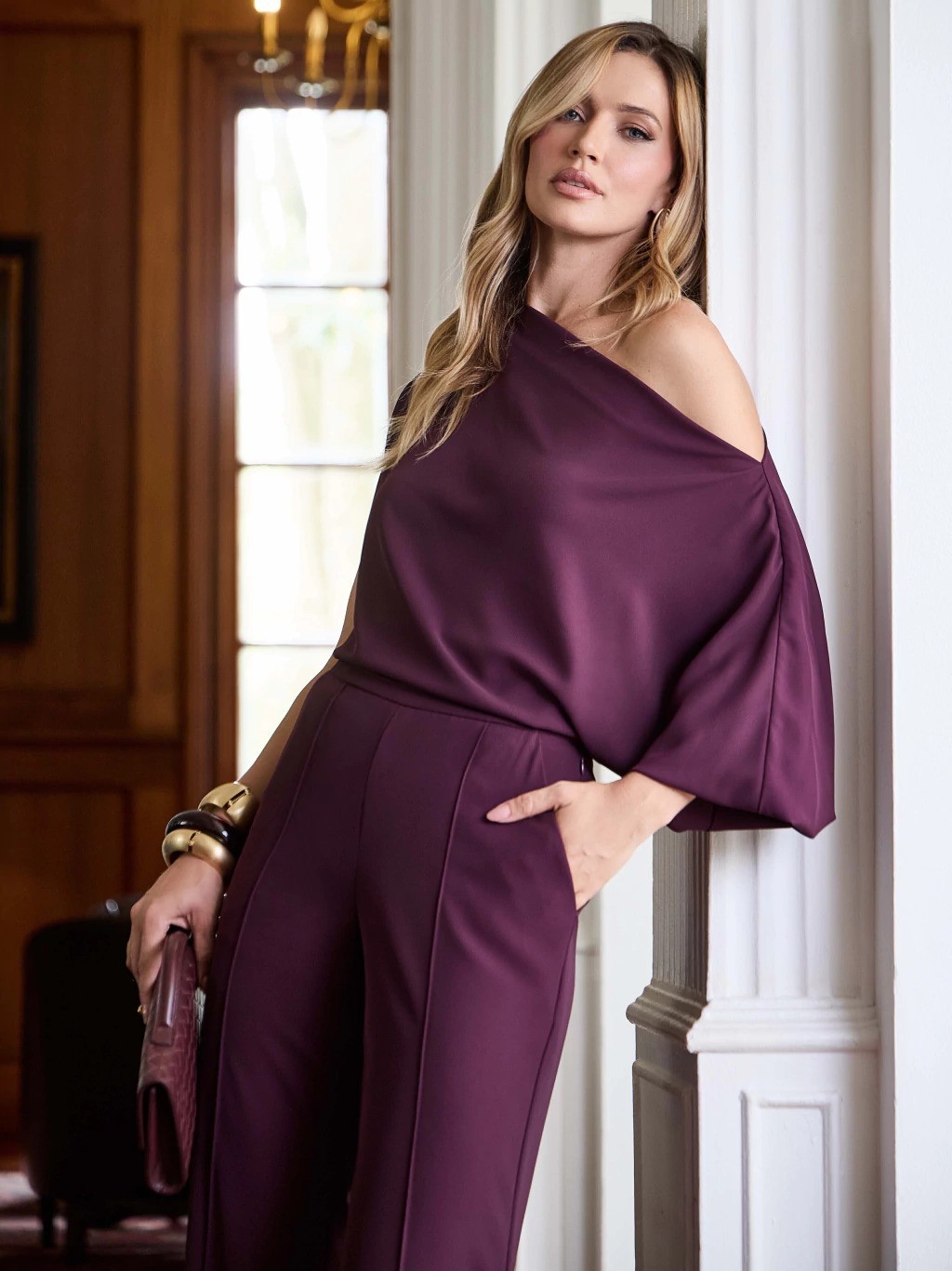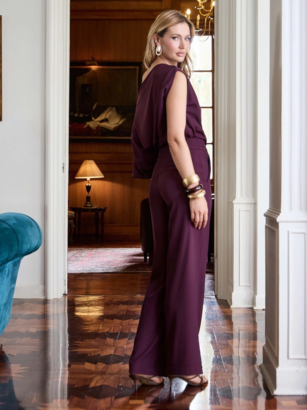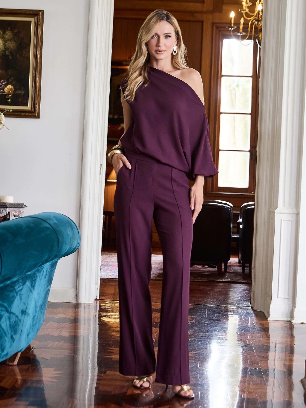 A blusa apresenta modelagem assimétrica com decote de um ombro só, manga longa única com punho de pregas, conferindo sofisticação ao look. Já a calça possui modelagem reta, cintura média, nervuras no cós e nas pernas, além de bolsos faca laterais e fechamento lateral por zíper, garantindo praticidade sem abrir mão do estilo.
